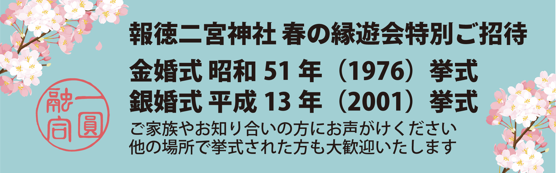 | [参加費] | お一人様 1万円(料理&飲物・税金) 【一般】 ●20代 :5,000円 ●小学生以下: 2,000円 ●未就学児無料 【金婚式・銀婚式】 ご夫妻を無料ご招待(要事前予約) ★当日必ず挙式当日のお写真又は証明できるものをご持参ください ★お連れ様(ご家族様など)は一般参加費となります |